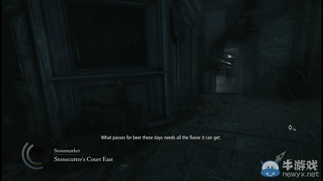 如果是想快速通过的话,还有更便捷的路径,先不要直接跳落到地面,沿着杂物通道西面的木板绕到杂物通道右后方(东北面)的一条后街(石匠院东)内。