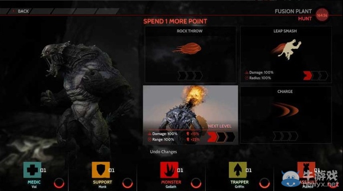 Goliath有着四种能力-蓄力攻击,飞翔攻击,火焰吐息和投掷石块。玩家可以通过菜单对怪兽的能力进行升级。