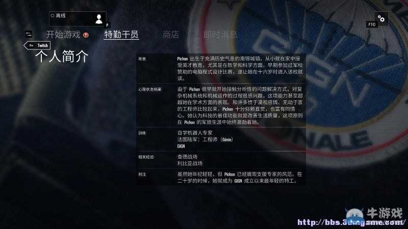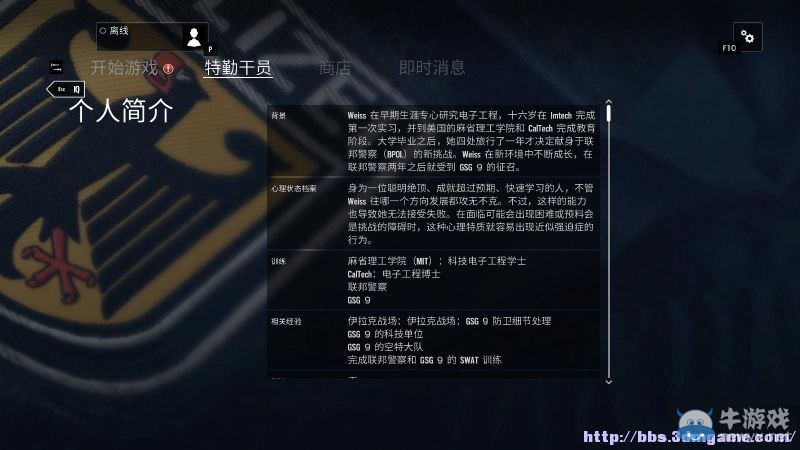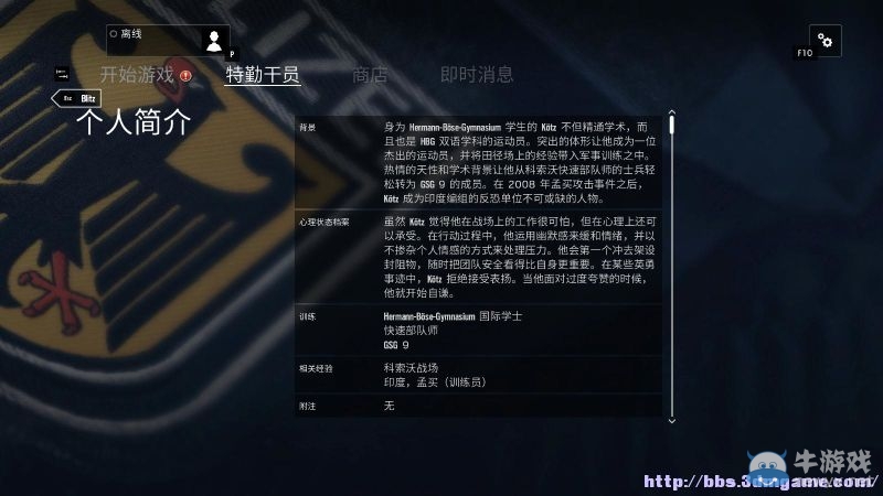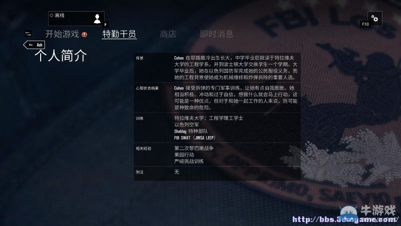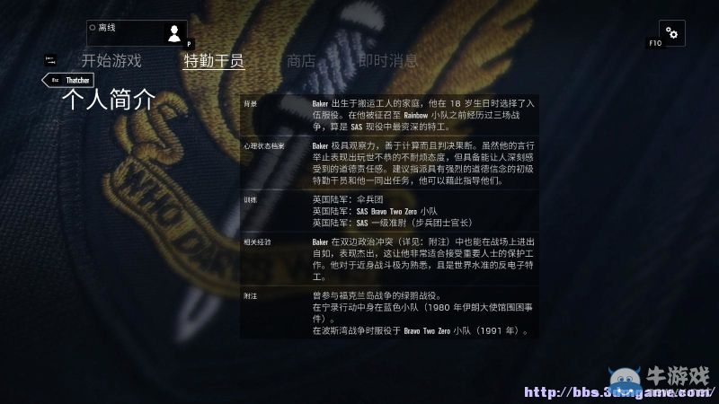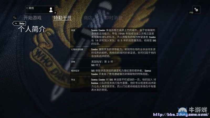 武器配备:闪光护盾G52战术护盾(主武器)、P12手枪(次武器)、爆破炸药(装备)、烟雾手榴弹(装备)