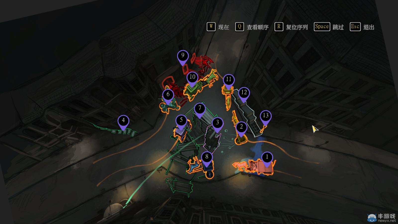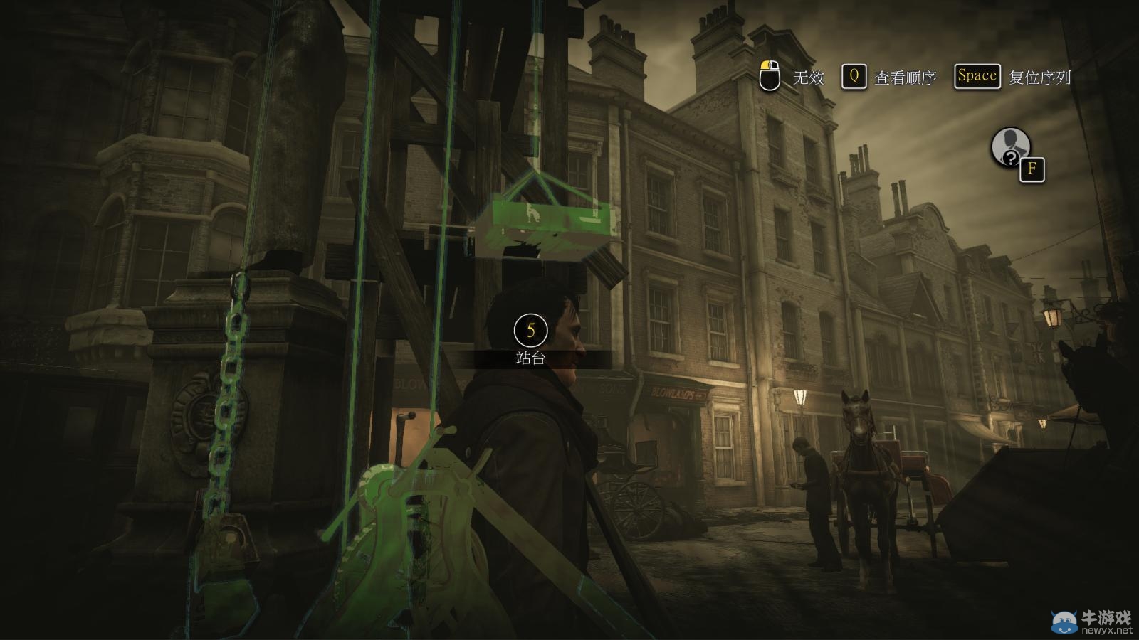 现场的所有马车,倒下的衣柜,遮住马眼睛的旗帜,断掉的旗帜,掉落在地的南瓜,还有倒落的电灯(手动拆除保险丝),南瓜车旁的先生(线索:技术马车突然停车,自己也紧急停车)。共13个要素。